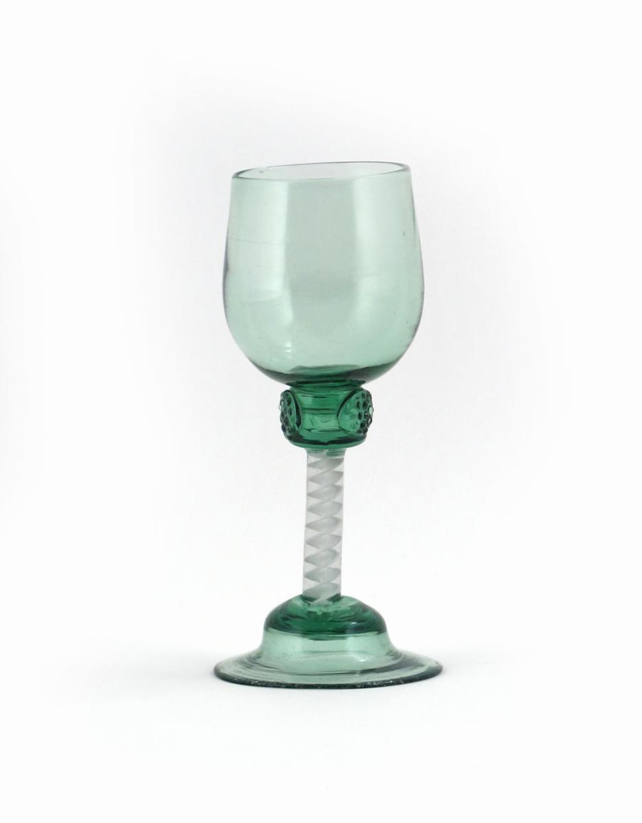 A rare green tinted wine glass c.1760-70, the pale green bowl above a hollow knop applied with three raspberry prunts, raised on an opaque twist stem above a green domed foot, 15.2cm.