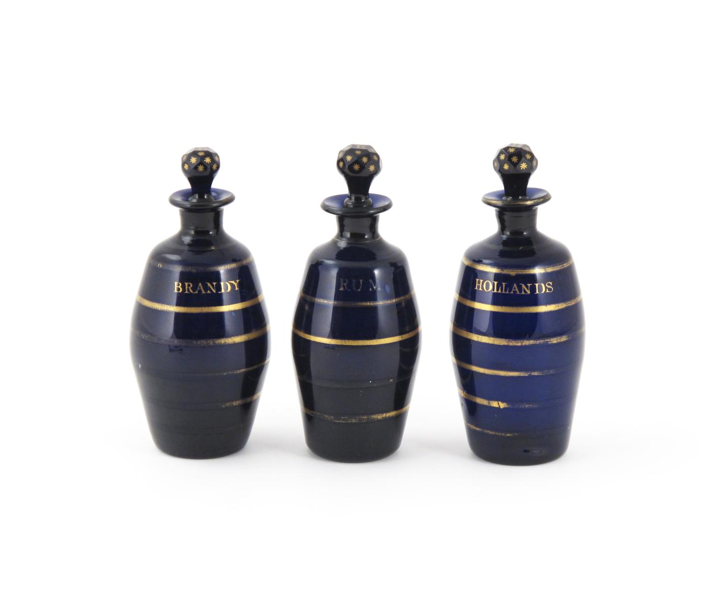 A set of three blue glass decanters and stoppers c.1800, the barrel-shaped bodies decorated with gilt horizontal bands and titled 'Rum', 'Brandy' and 'Hollands', the faceted stoppers with star motifs and initialled, 20cm. (6)