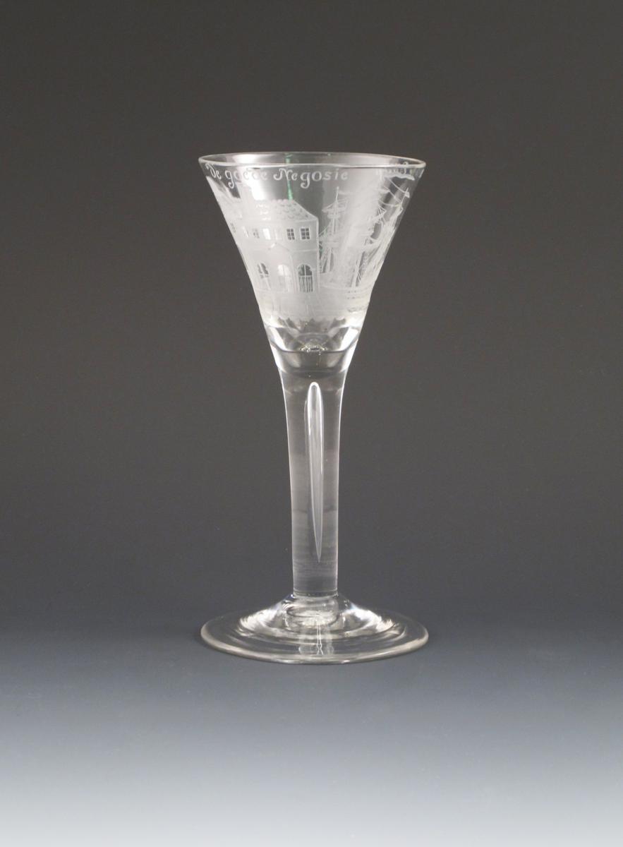 A good and large glass goblet mid 18th century, the drawn trumpet bowl Dutch-engraved with a three-masted ship flying the Dutch flag, beside a Customs House with a cornucopia draped across one gable, inscribed 'de goede Negosie aan de Caap' (Good trade to the Cape), raised on a teardrop stem, 20.5cm.
