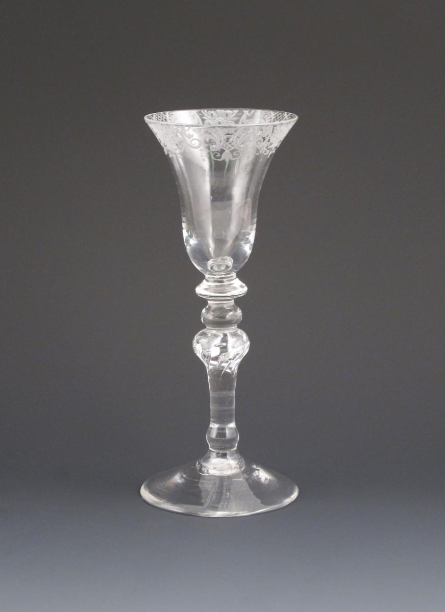 A Newcastle light baluster glass c.1750, the narrow bell-shaped bowl engraved with a wide rim of of flowers, leaves and scrolls set with polished circles, the stem with a knop containing two rows of tears, 17.2cm.