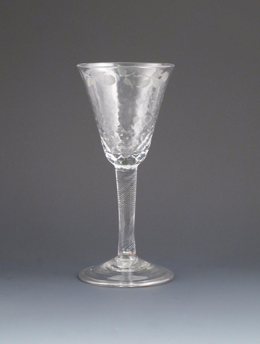 A good and rare cider glass c.1740, the generous bowl with hammered effect, the rim engraved with sprays of apples, pears and other fruit, raised on an incised twist stem above a folded foot, 17.5cm.