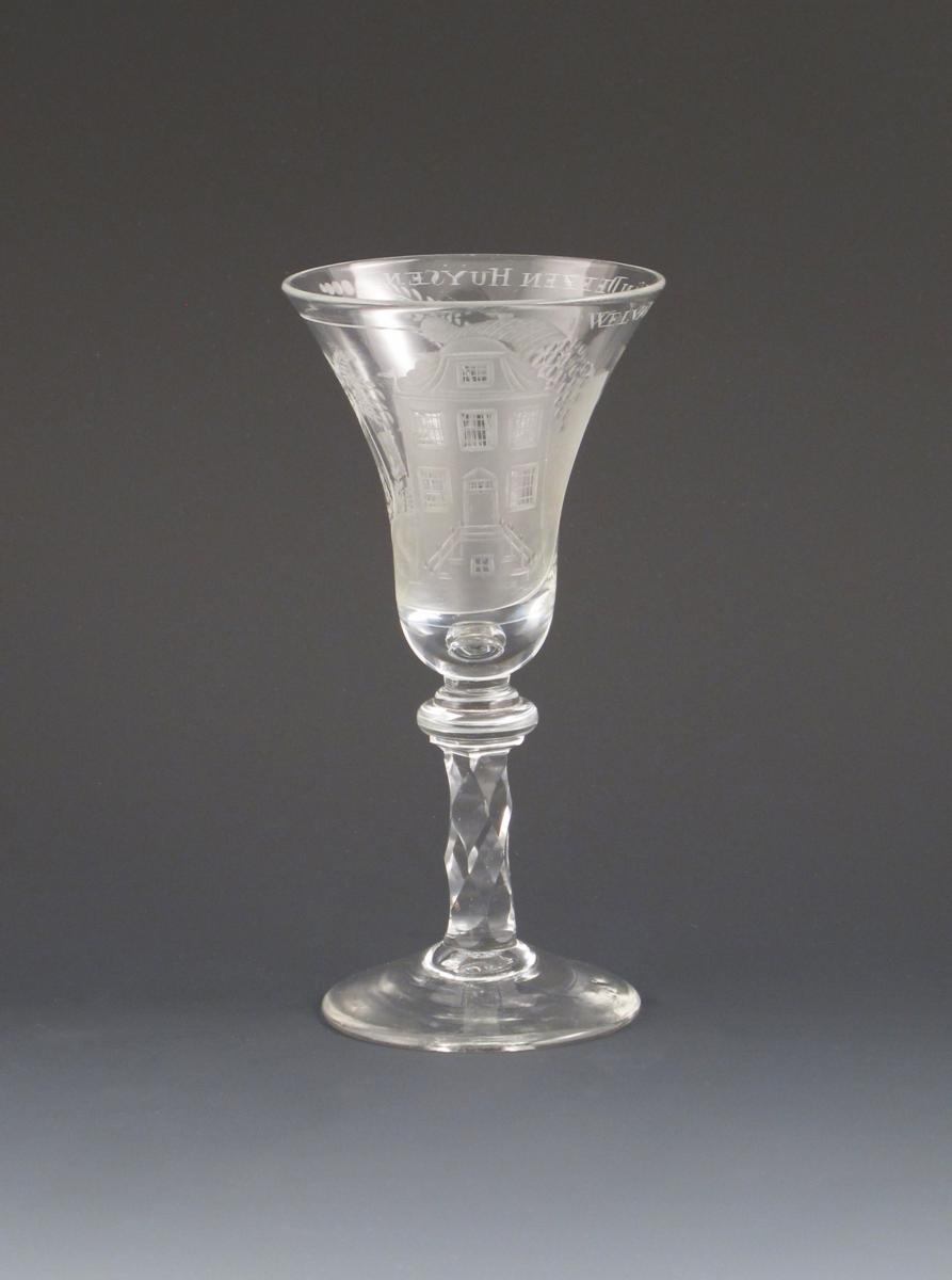 A large wine glass c.1760, the bell-shaped bowl Dutch-engraved with a ship beside a small Customs House with fruiting cornucopia, inscribed 'T. Welvaren Van Deezen Huysen', raised on a knopped and faceted stem, 17cm.