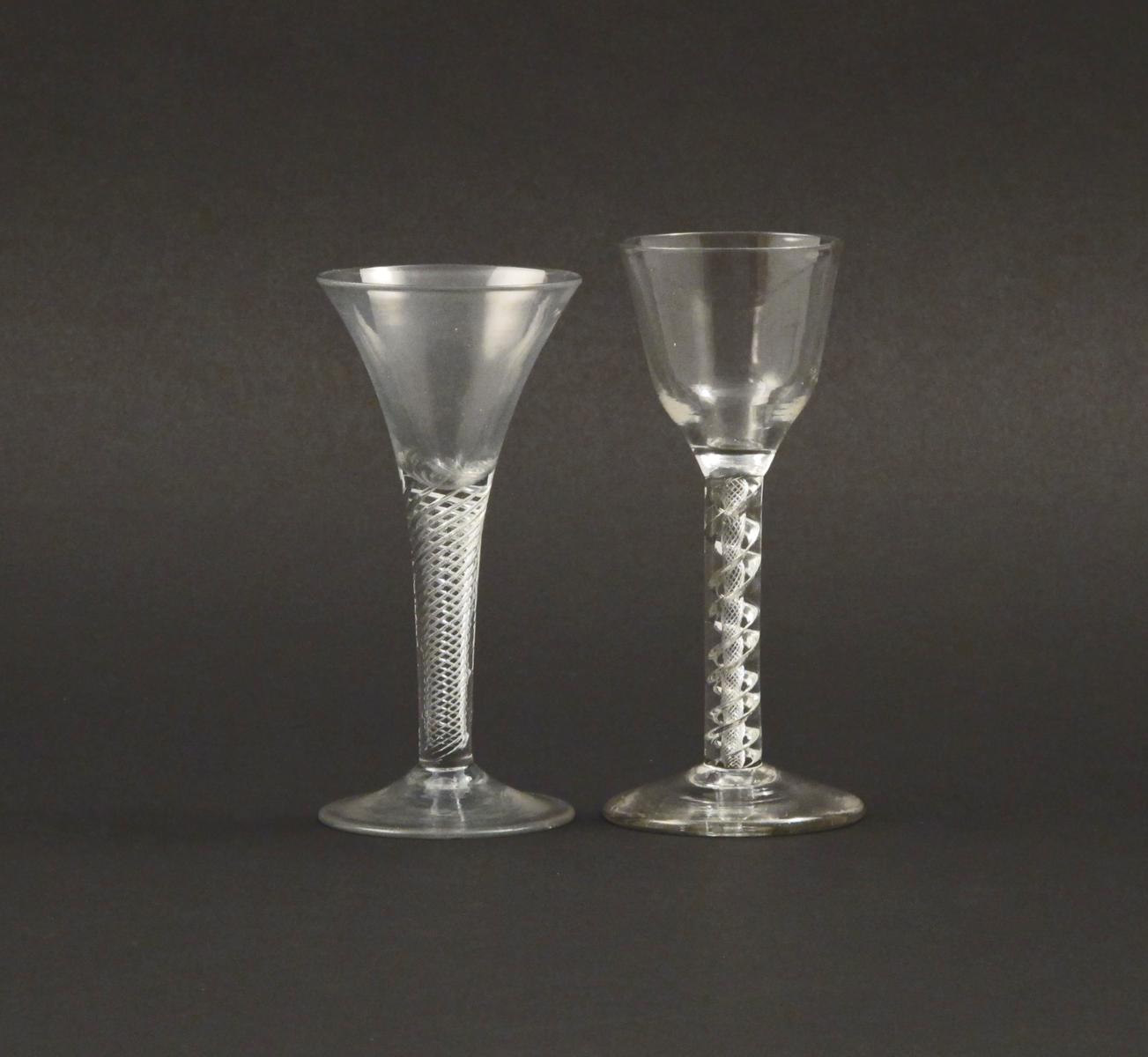 Two wine glasses c.1760, one with a drawn trumpet bowl raised on an airtwist stem, the other raised on a mixed twist stem, 16cm max. (2)