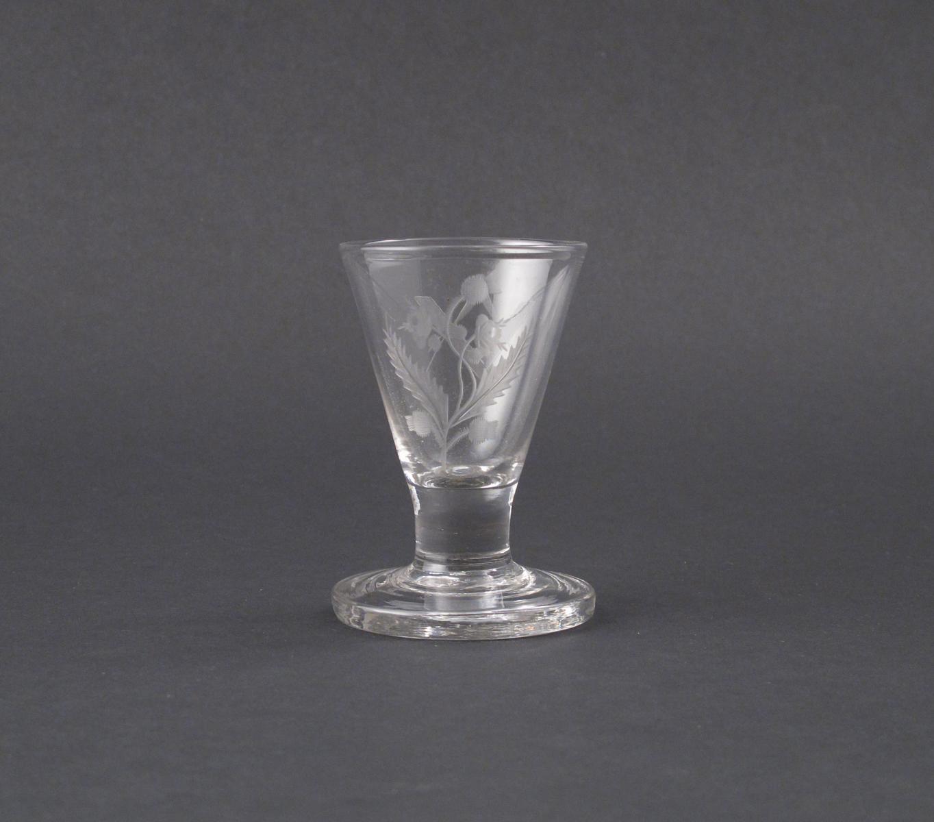 A Masonic firing glass of Jacobite significance 2nd half 18th century, the flared bowl engraved with a set square and compasses, the reverse with a spray of thistle, 8.7cm.