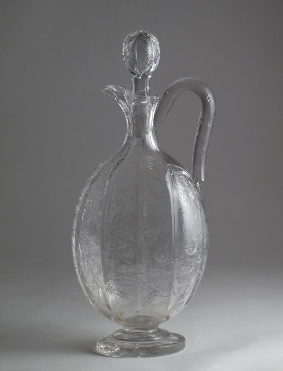 A Stourbridge glass ewer and stopper c.1880-90, in imitation of rock crystal, the flattened faceted body engraved with continuous floral sprays, extending over the handle and the blown stopper, the stopper perhaps associated, 31.5cm. (2)