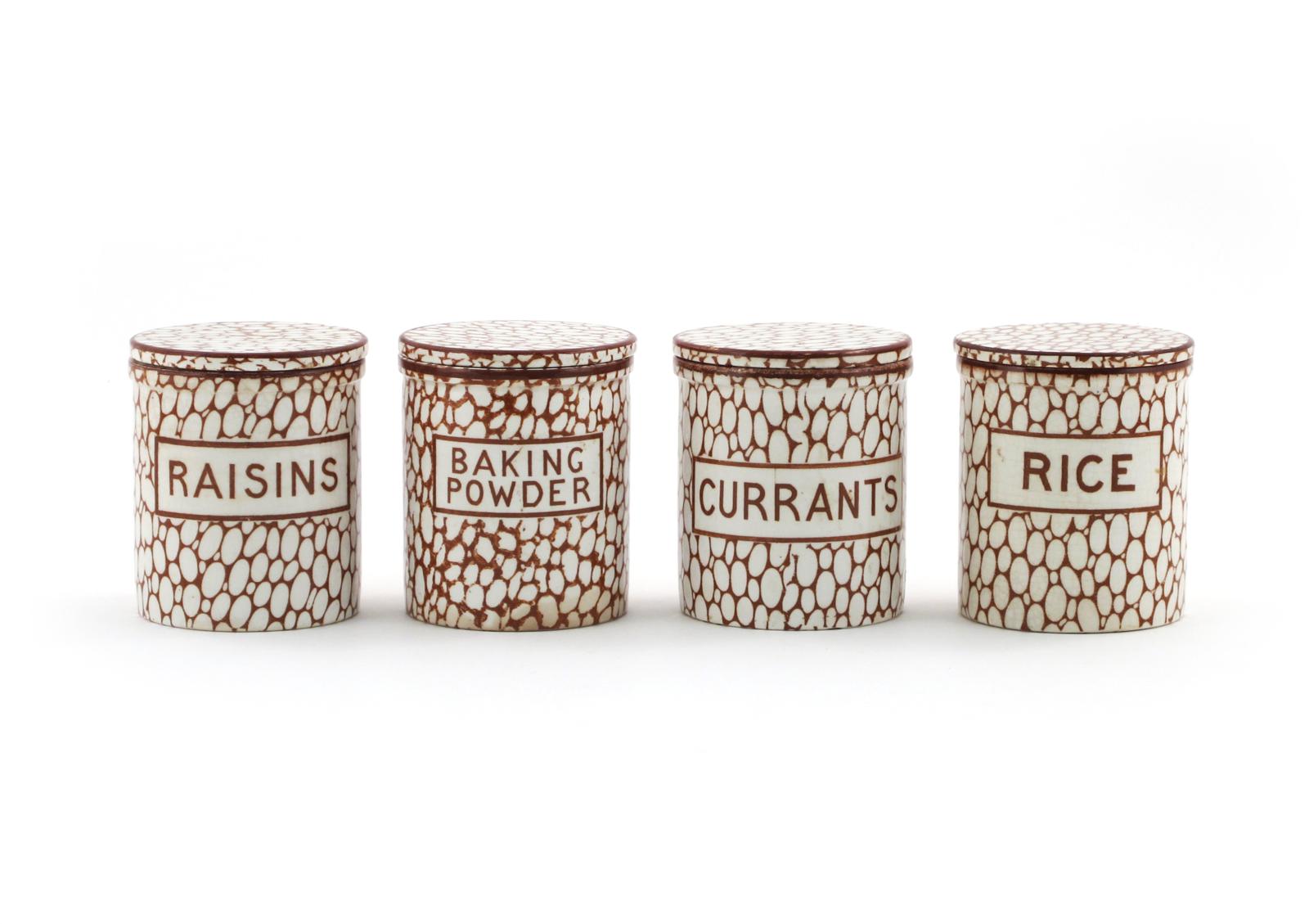 Four Maling 'Cobble Stone' storage jars and covers 20th century, printed in brown and titled 'Raisins', 'Baking Powder', 'Currants' and 'Rice', printed marks, 10.2cm. (8)