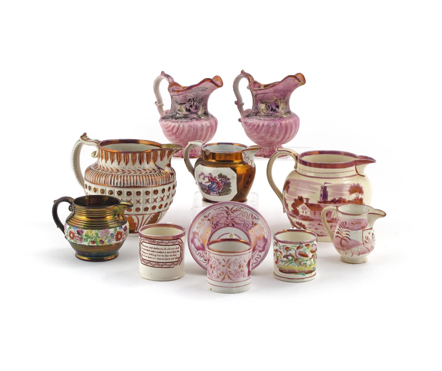 Seven pearlware lustre jugs 19th century, one moulded with bands of leaves and flowerheads, one painted with a purple lustre landscape, a pair printed with Snipe Shooting and Coursing scenes, one printed with Hope, the others moulded or painted with flowers, together with three lustre cans and one saucer, some faults, 14cm max. (11)