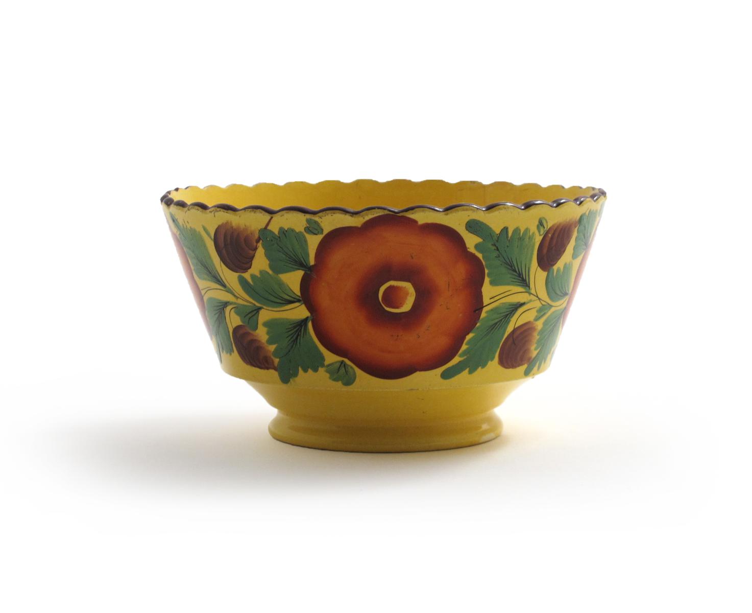 A yellow pearlware bowl c.1820, perhaps Welsh, boldly painted with a continuous band of red flowerheads against a rich, canary yellow ground, painted 4 mark to the base, a short rim crack, 16cm dia.