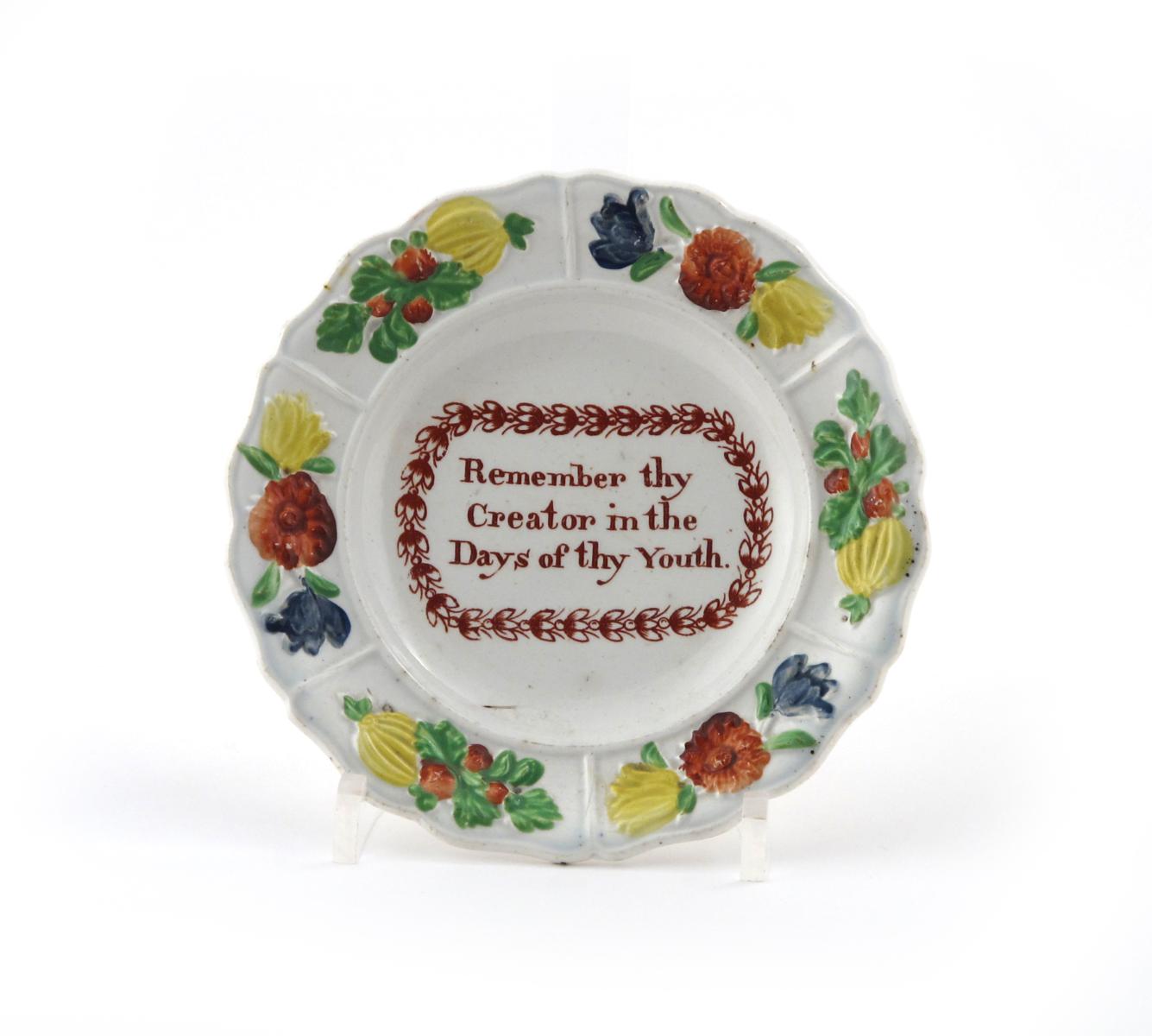 A good child's pearlware plate early 19th century, the rim moulded and coloured with vignettes of fruit and flowers, the well inscribed 'Remember thy Creator in the Days of thy Youth', 13.7cm.