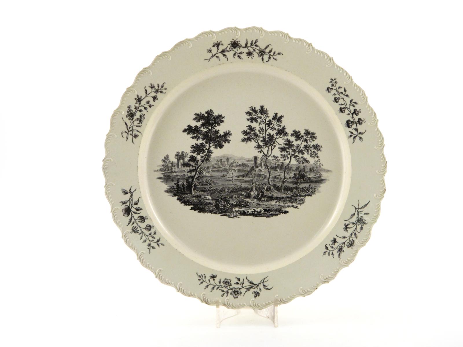 A massive creamware circular charger late 18th/early 19th century, printed in black with a courting couple seated in a watery landscape with ruins behind, the feather-moulded rim printed with flower sprays, 44.2cm.