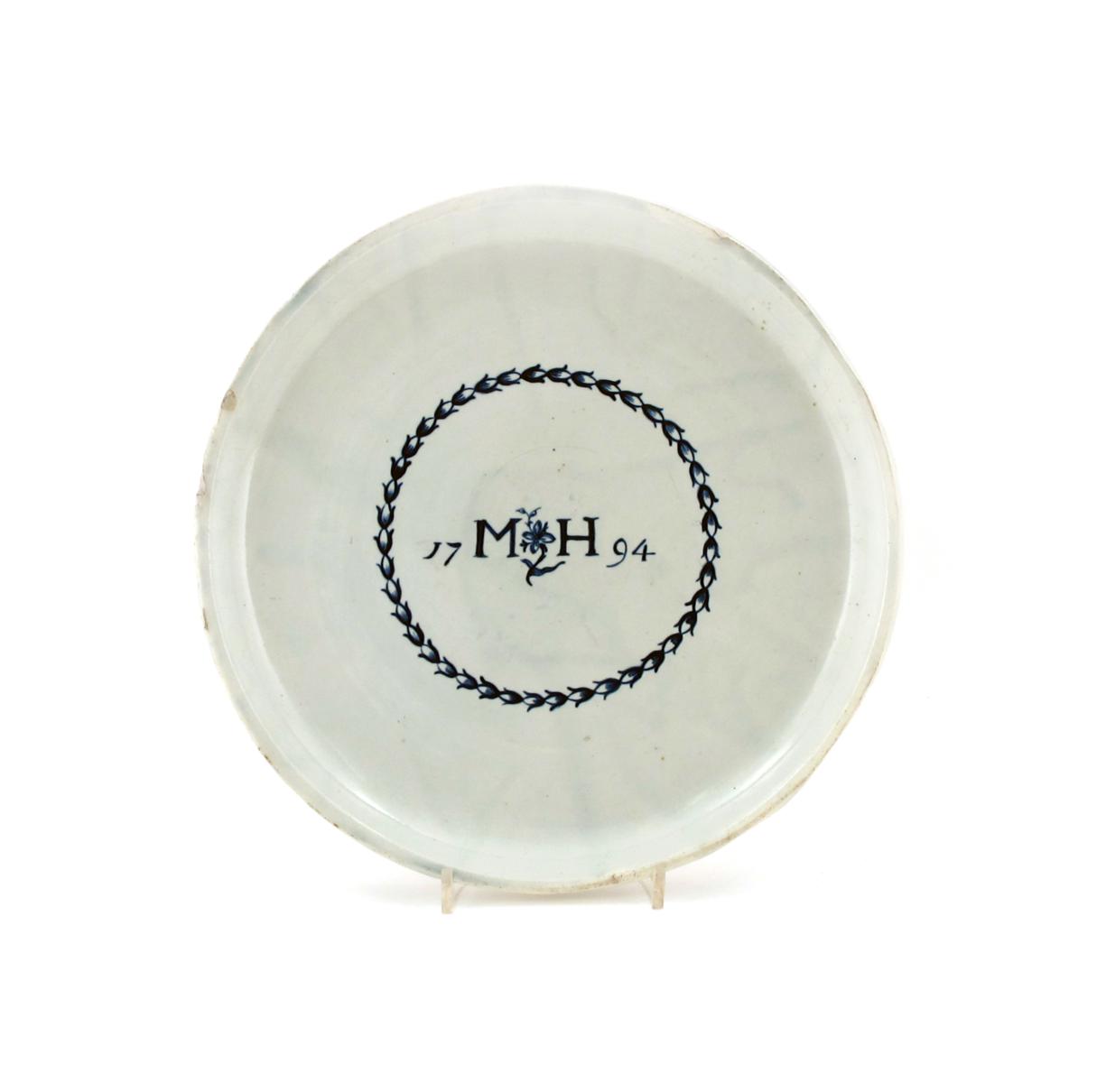 A large dated pearlware tray c.1794, of shallow circular form painted in blue with the initials MH and date 1794 within a husk border, the underside ground, small rim chips, 33.5cm.