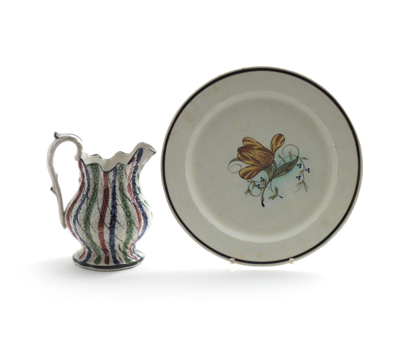 A moulded pearlware jug and a creamware plate early 19th century, the jug moulded with an allover daisy design and striped in Portobello colours, the plate decorated with a central tulip in the Prattware palette, 24.5cm max. (2)