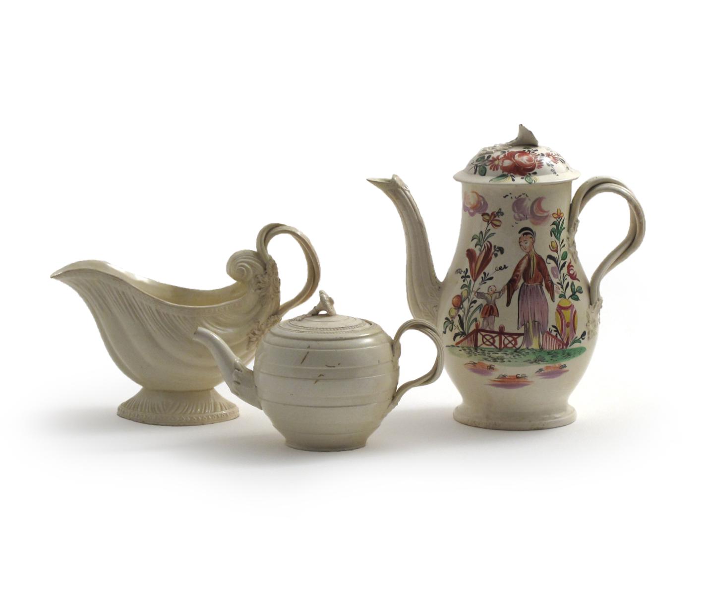 A large creamware coffee pot and cover c.1770-80, brightly painted with a Chinese mother and child in a garden scene, a creamware teapot and cover, moulded with horizontal bands, and a large creamware shell-shaped sauceboat, all with double strap handles issuing from floral motifs, some damages and restoration, 22.5cm max. (5)