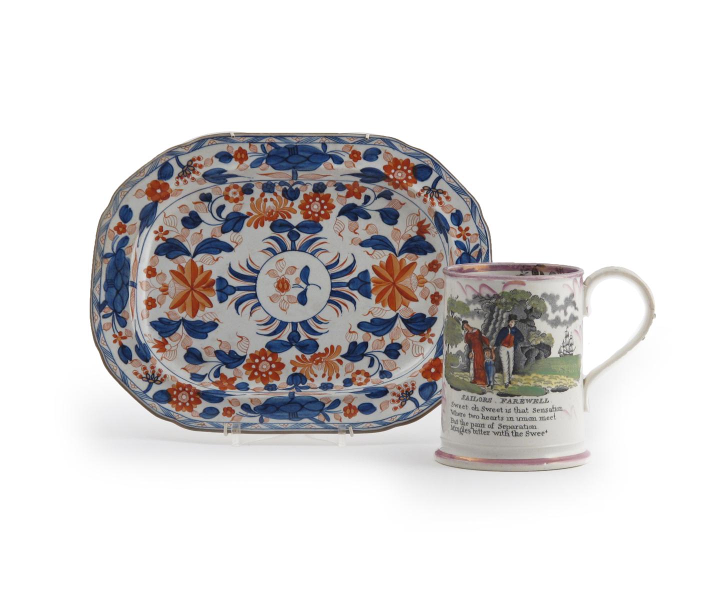A Sunderland lustre frog mug 19th century, printed with the Sailor's Farewell, the reverse with a six line verse, the interior with a black frog clambering up the inside, and a pearlware octagonal dish painted in blue and red with a Japan pattern, 27cm max. (2)