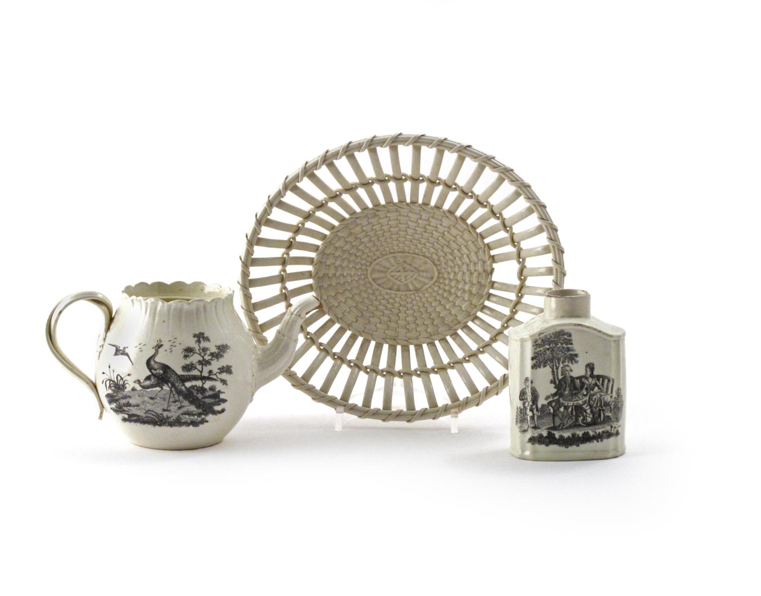 Three pieces of Wedgwood creamware late 18th/early 19th century, including a tea canister printed in black with a tea party scene, the reverse with two sets of initials within a foliate cartouche, a teapot printed with peacocks, and a slatted basket, impressed marks, the teapot's cover lacking, a chip to the canister's rim, 22.5cm max. (3)