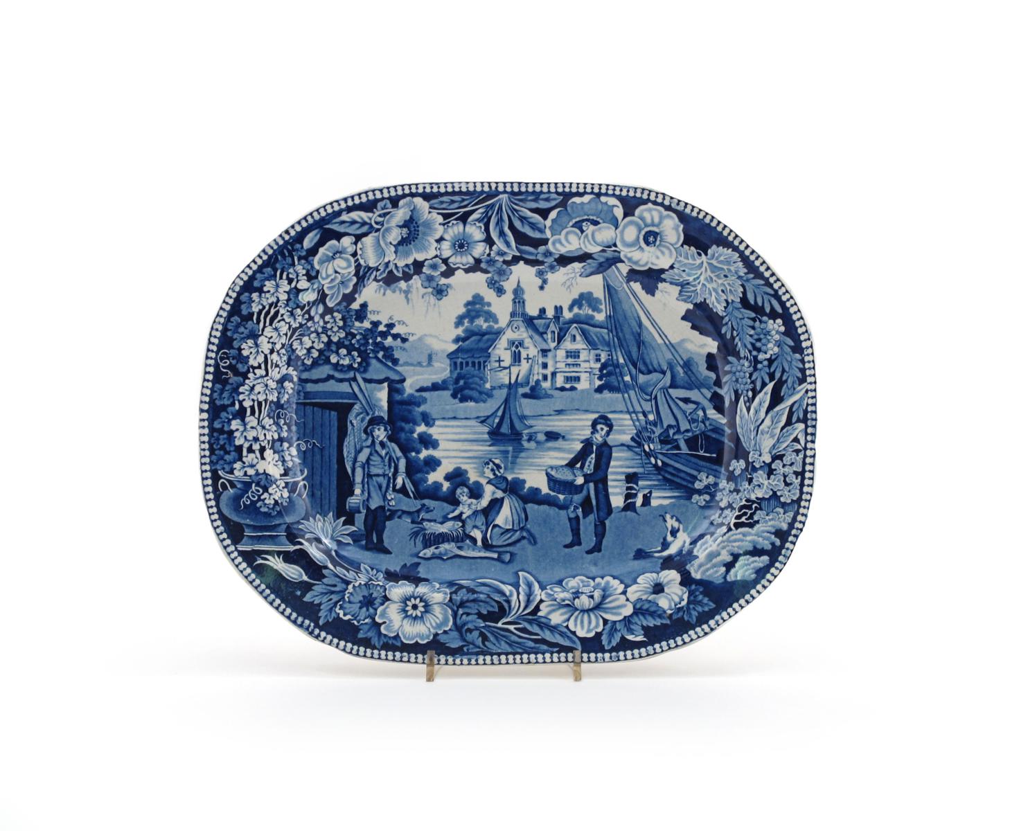 A good blue and white transfer-printed meat dish 19th century, decorated with the Fisherman's Hut pattern, with four figures and baskets of fish before sailing boats, the border with a wide floral band, impressed N mark, 38.5cm.