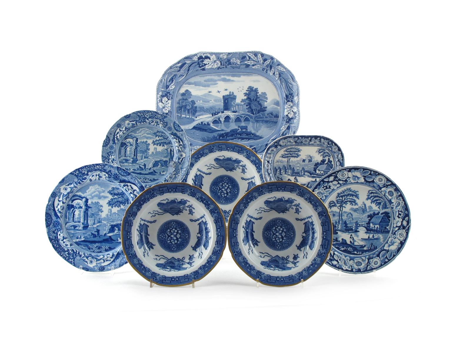 Eight Spode blue and white transferware dishes 19th century, variously decorated with figures before ruins, in riverside landscapes, and with Chinese scrolls and other objects, some with impressed marks. Comprising: an oblong charger, three soup plates, three different plates in two sizes, and a sauce tureen stand. (8)
