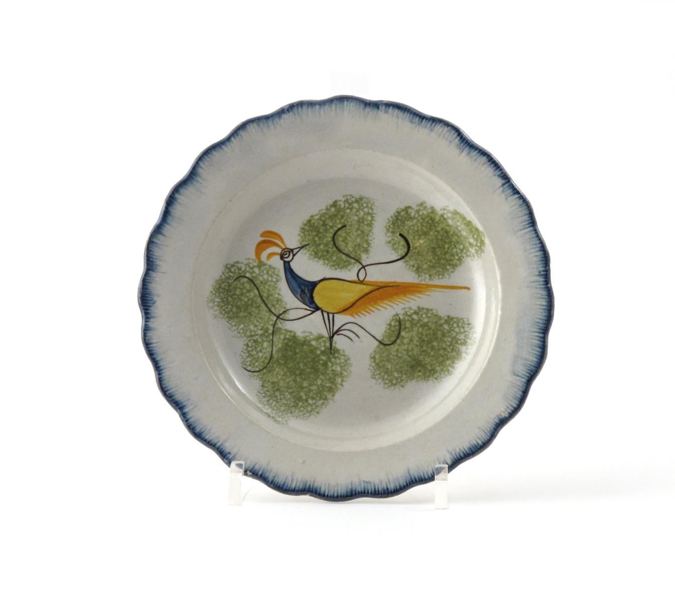 A small Pratt ware plate c.1800-10, decorated in a typical palette with a peacock within sponged green foliage, the shaped rim with blue feathering, 16.2cm.