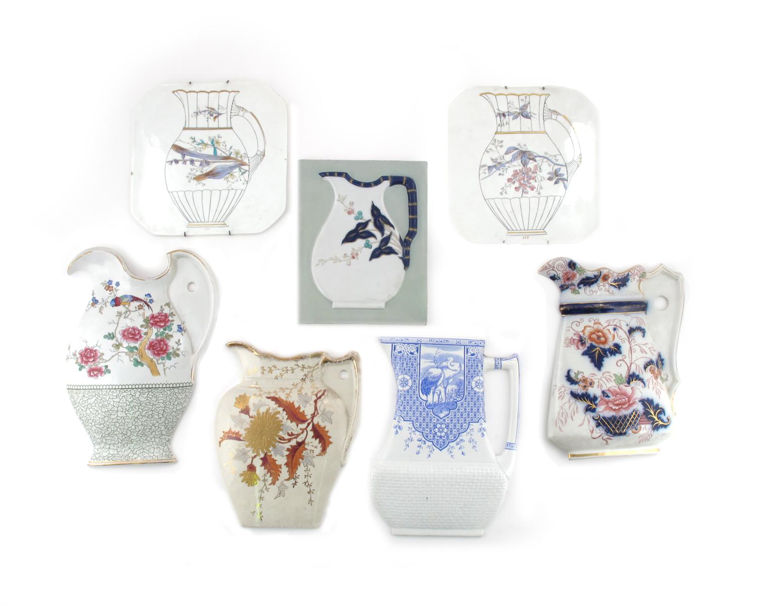 Three wall plaques late 19th/early 20th century, one moulded with a jug with a bamboo handle, two of chamfered square shape painted to each side with a jug decorated in the Aesthetic manner, and four wall-mounted jugs variously decorated with birds and flowers following a theme of Japonism, 30cm max. (7)