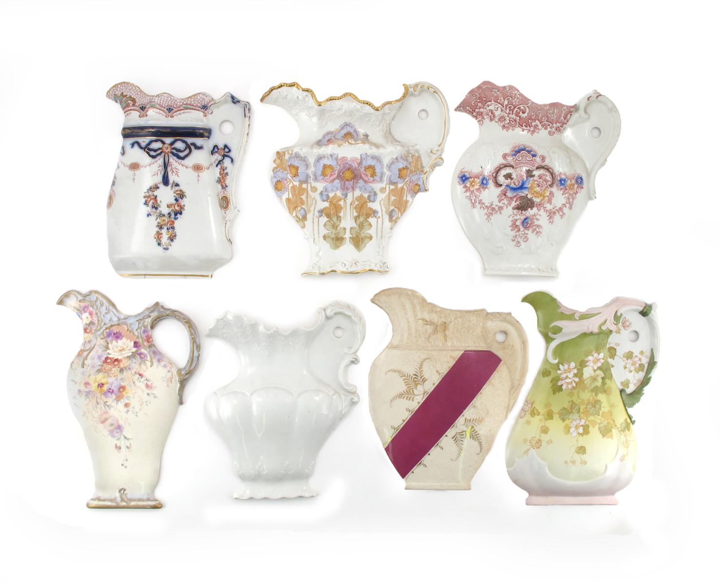 Seven English and Continental pottery wall-mounted jugs 19th and early 20th century, variously moulded and decorated with flowers and foliate scrolls, 34cm max. (7)