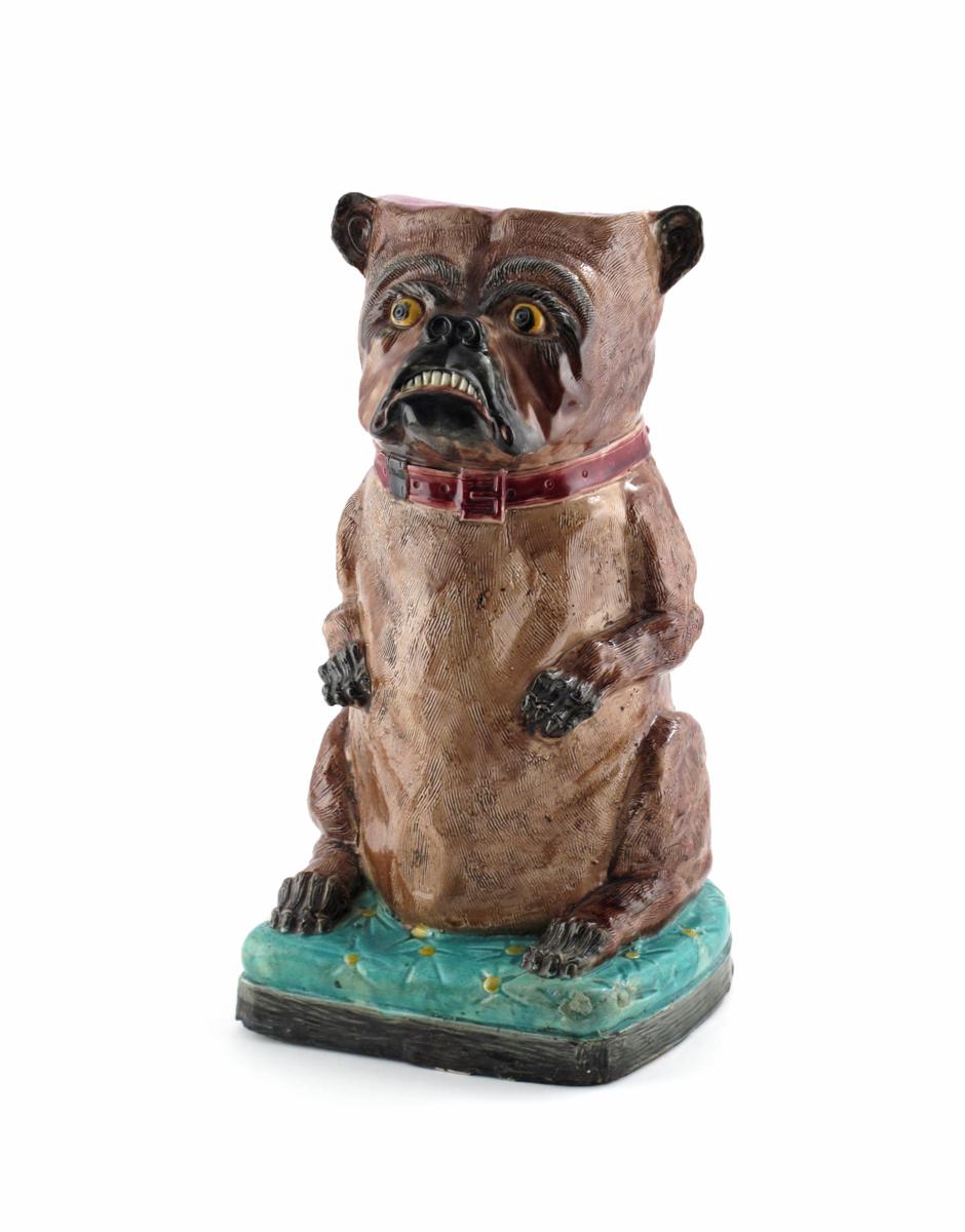 A rare Majolica stick stand 19th century, modelled as a pug dog, seated on its haunches on a green studded cushion and wearing a red collar, the fur finely incised, the interior glazed in pink, 53cm.