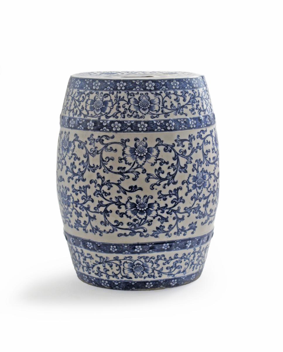 A Minton earthenware garden seat date code for 1907, of barrel form, decorated in the Chinese Ming manner with a continuous design of blue flowers and scrolling leaves, printed and impressed marks, 47cm.