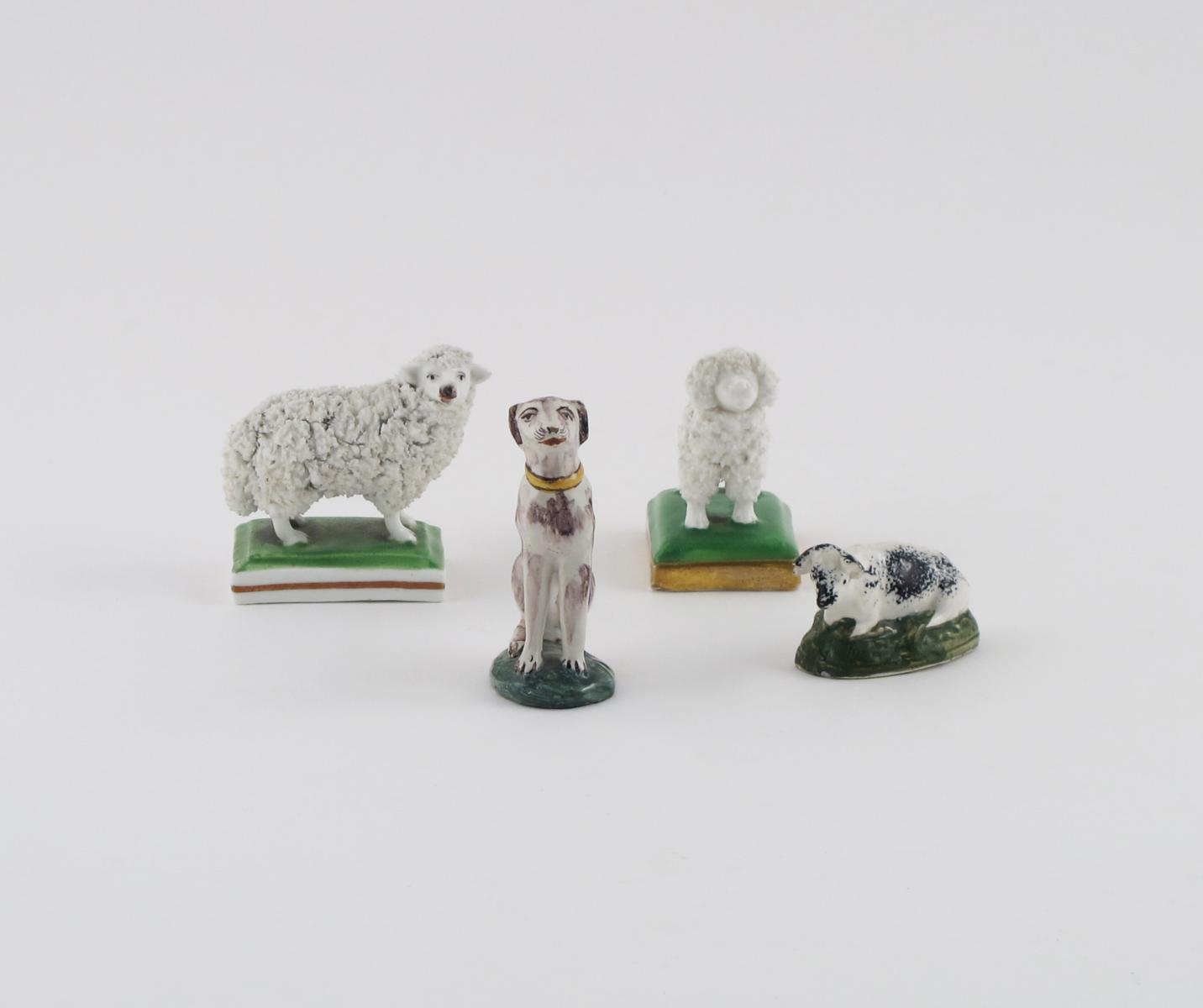 Two Staffordshire porcelain animals 19th century, a poodle and a sheep, both standing four square on green bases, a pearlware model of a recumbent cow, decorated in Portobello type enamels, and a tin-glazed model of a seated dog with a manganese coat, 7.5cm max. (4)