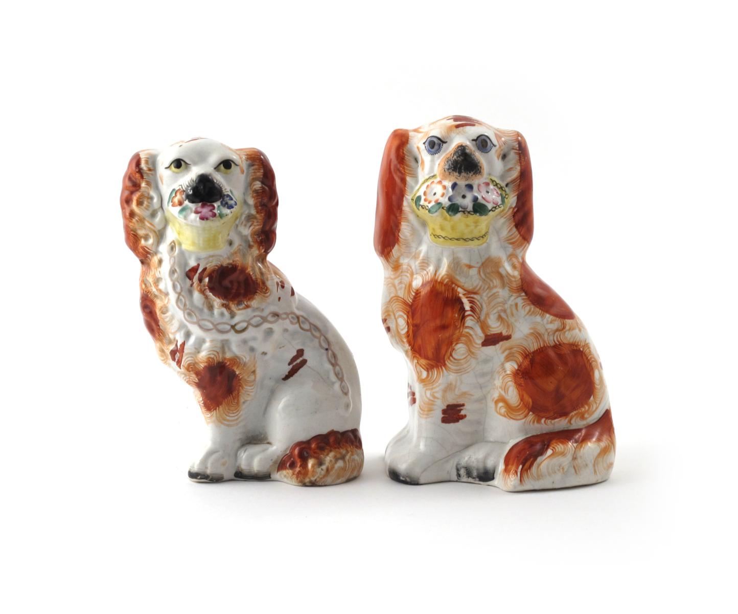 Two Staffordshire spaniels with baskets 19th century, each seated with head turned to dexter, a basket of flowers in their muzzles, one with blue eyes, 19.5cm max. (2)