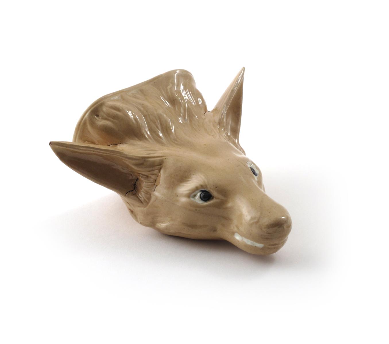 A good creamware stirrup cup c.1800, modelled as a wolf's or dog's head with long ears and teeth slightly bared, glazed in a pale coffee colour, 12cm.