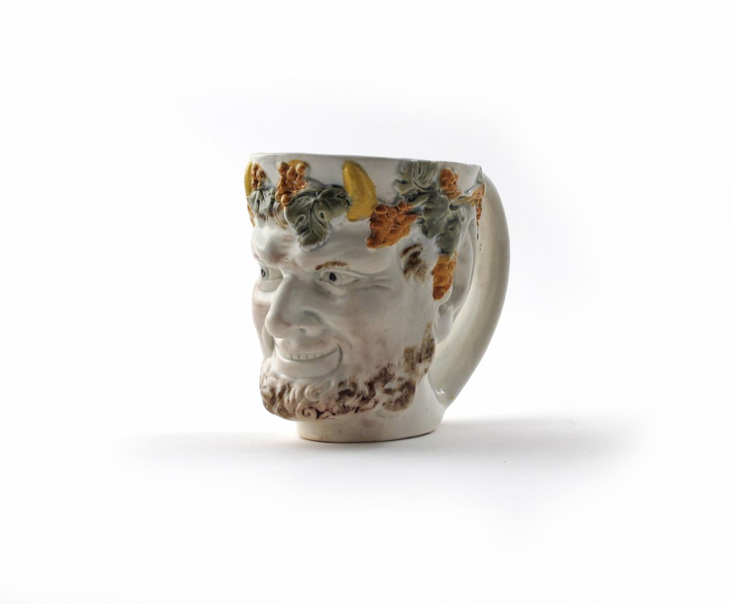 A good Prattware Bacchus jug early 19th century, moulded with a grinning, bearded face encircled by grapevine, 9cm.
