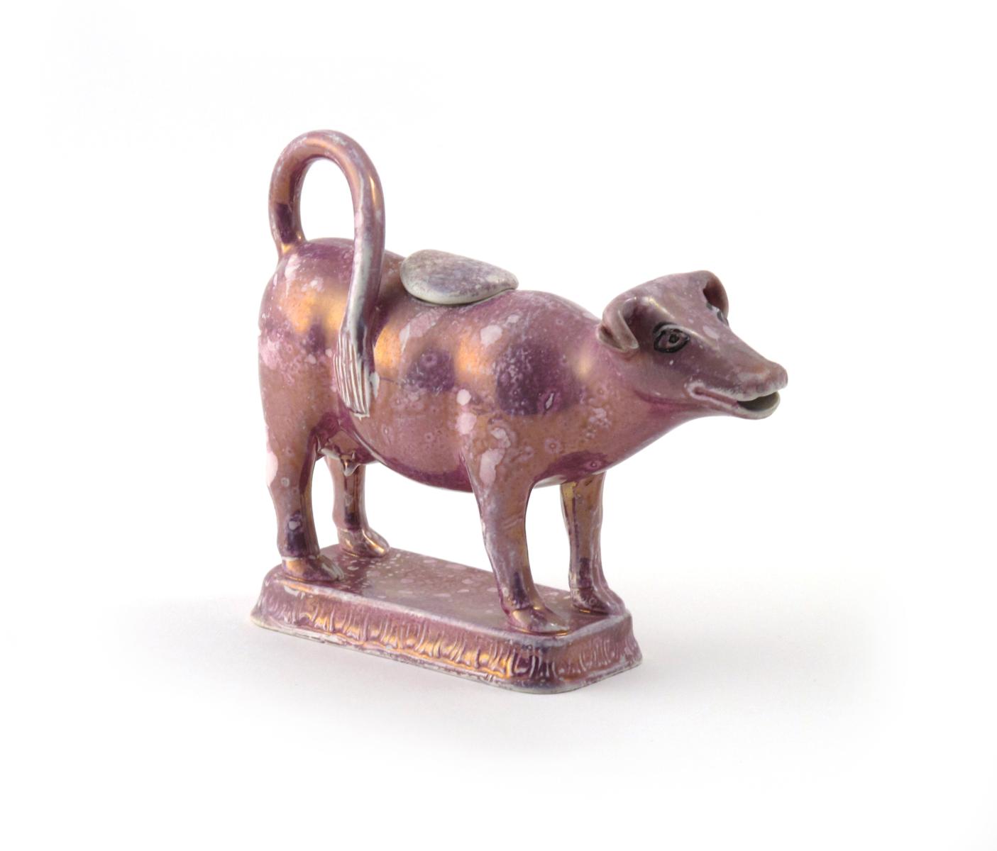 An unusual Sunderland lustre cow creamer and cover early 19th century, standing four square on a rectangular base, decorated all over in purple lustre, some good restoration to the face and cover, 16cm. (2)