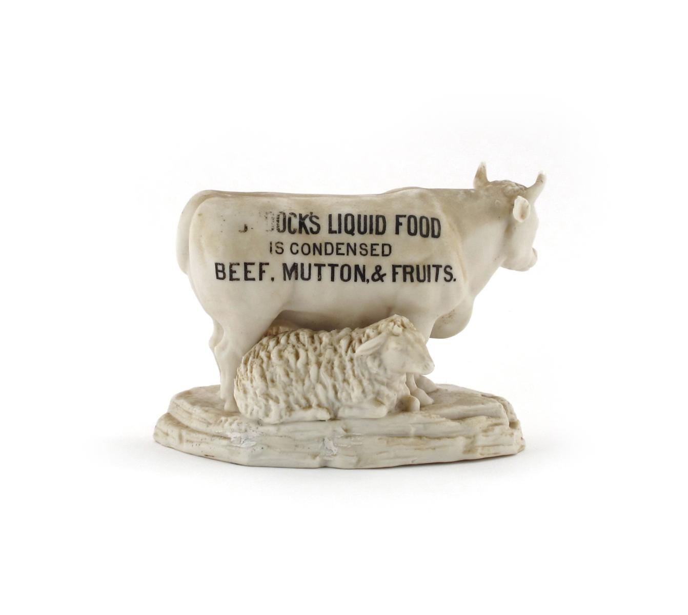 A rare Goss bisque-porcelain advertising model c.1882, of a cow and two sheep raised on a low rocky base, the cow's back printed with the slogan 'Murdock's Liquid Food is condensed Beef, Mutton & Fruits', printed mark to the base, 21cm across.
