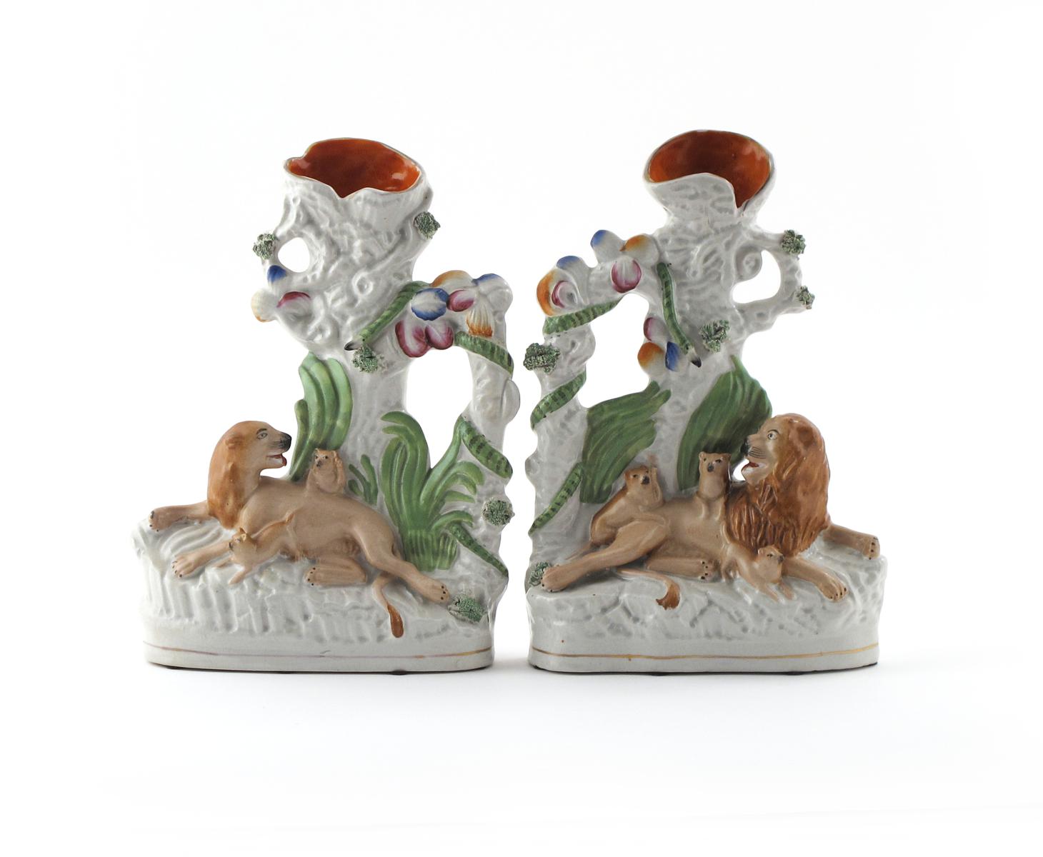 A good pair of Staffordshire lion group spill vases 19th century, modelled with a lion and a lioness with their cubs, each with a green snake entwined over branches above them, 30cm. (2)
