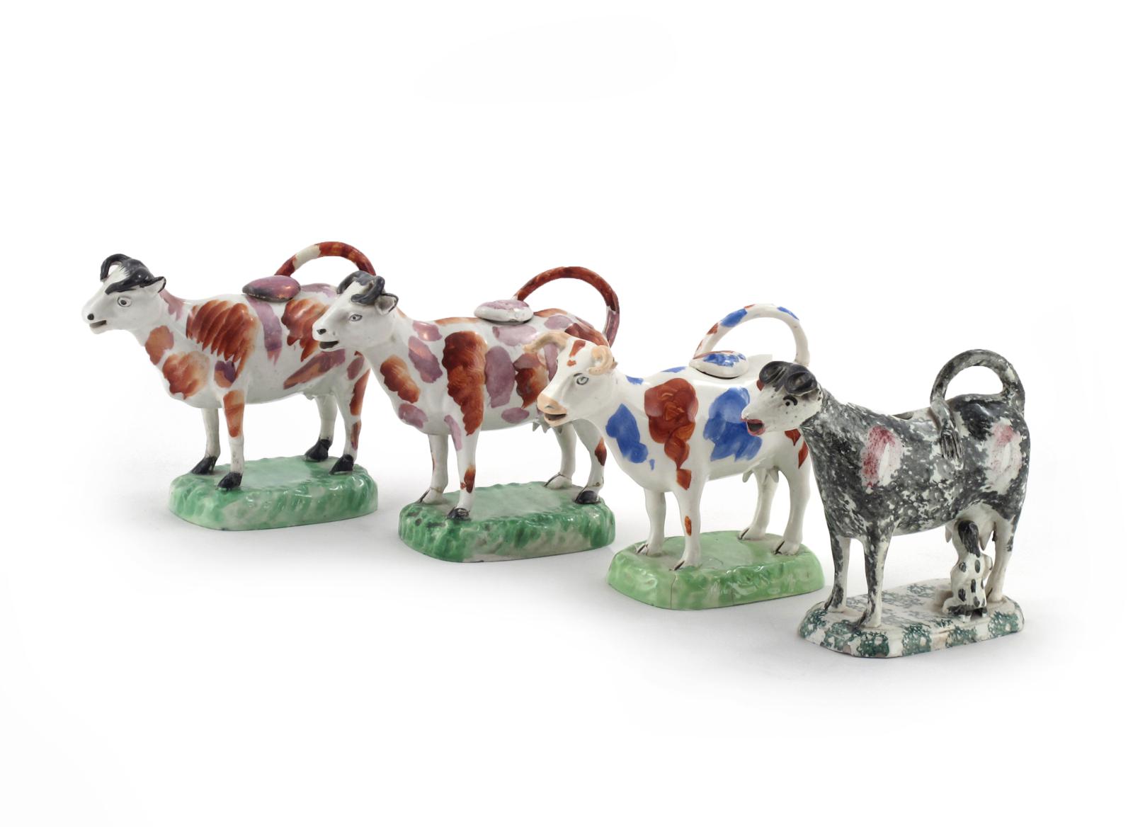 Four cow creamers and three covers early 19th century