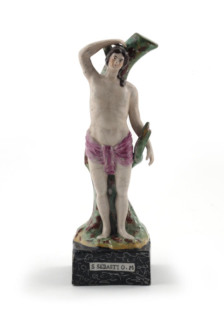 A pearlware figure of St Sebastian 1st half 19th century, wearing a purple loin cloth and standing before a tree stump, raised on a square titled base, his raised arm broken and restuck, 25cm.