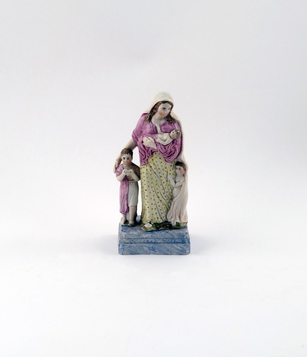 A pearlware figure of Charity c.1800, cradling a baby with two further small children by her side, raised on a square blue marbled base, 22.5cm.