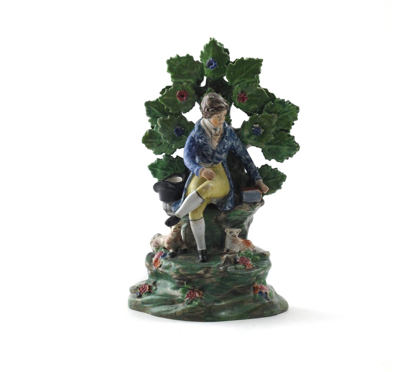 A Staffordshire pearlware figure of a scholar 1st half 19th century, dressed in a ruffled shirt and blue coat, seated before flowering bocage with his top hat to one side, a large book to the other, a sheep and a dog recumbent at his feet, some restoration, 22.5cm.
