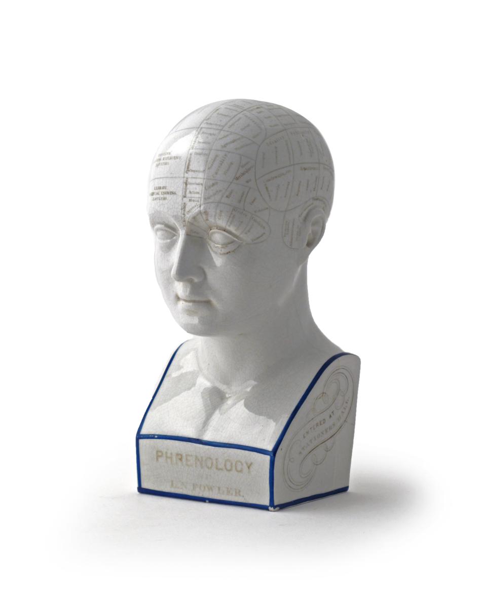 A Staffordshire pottery phrenology head by L N Fowler 2nd half 19th century, the scalp divided and inscribed with the brain's various areas of activity, titled to the front, the reverse with a recommendation from the producer, 29cm.
