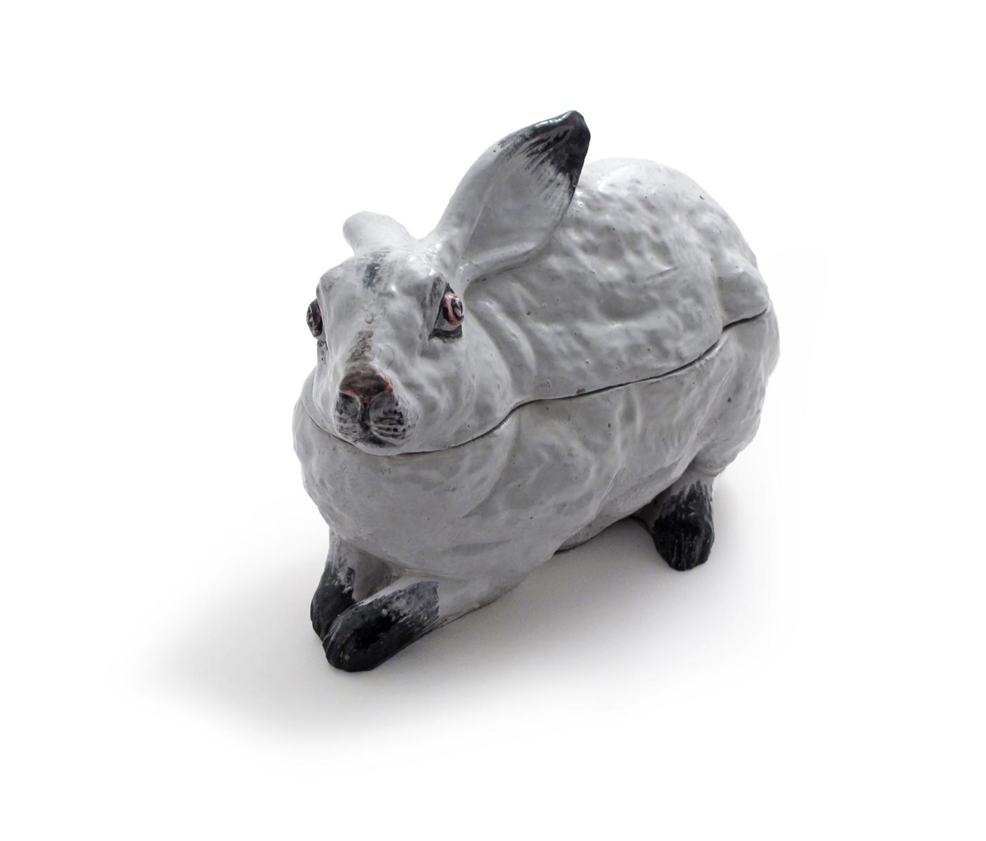 A Continental tin-glazed rabbit tureen and cover 19th century, of large size, the rabbit recumbent with ears back, glazed in white and highlighted in grey and pink, 42cm across. (2)