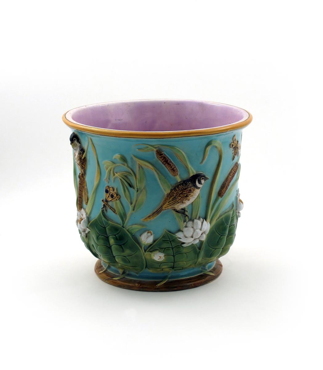 A George Jones Majolica jardinière 2nd half 19th century, applied with sparrows and damselflies perched and in flight among bulrushes above a band of water lilies, reserved on a turquoise ground, 30cm.