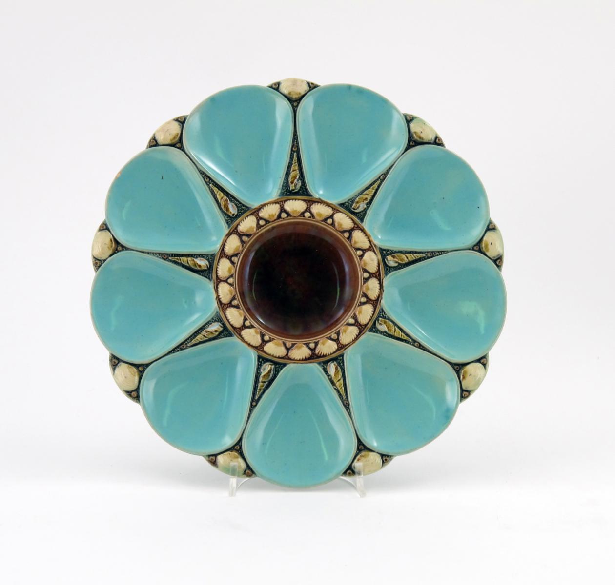A Minton Majolica oyster dish date code for 1870, moulded with nine shallow shells enamelled in turquoise around a central well, impressed marks, 25.3cm.