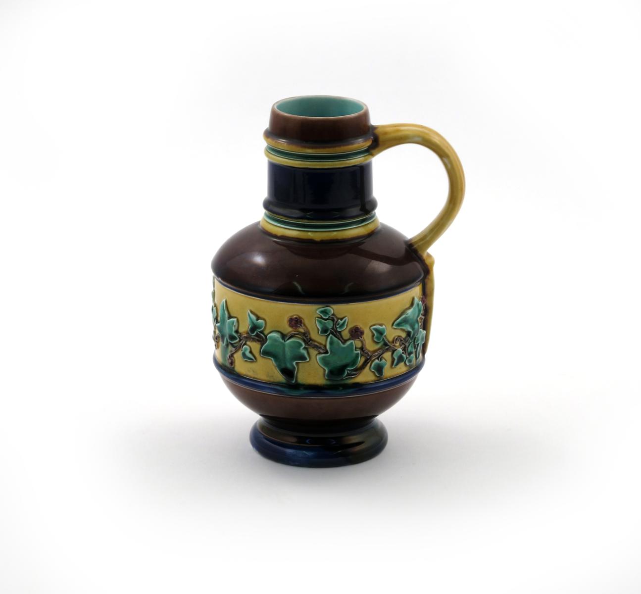 A Wedgwood Majolica jug 2nd half 19th century, applied with a band of berried ivy between bands of brown, blue, green and yellow enamels, impressed mark, 20cm.