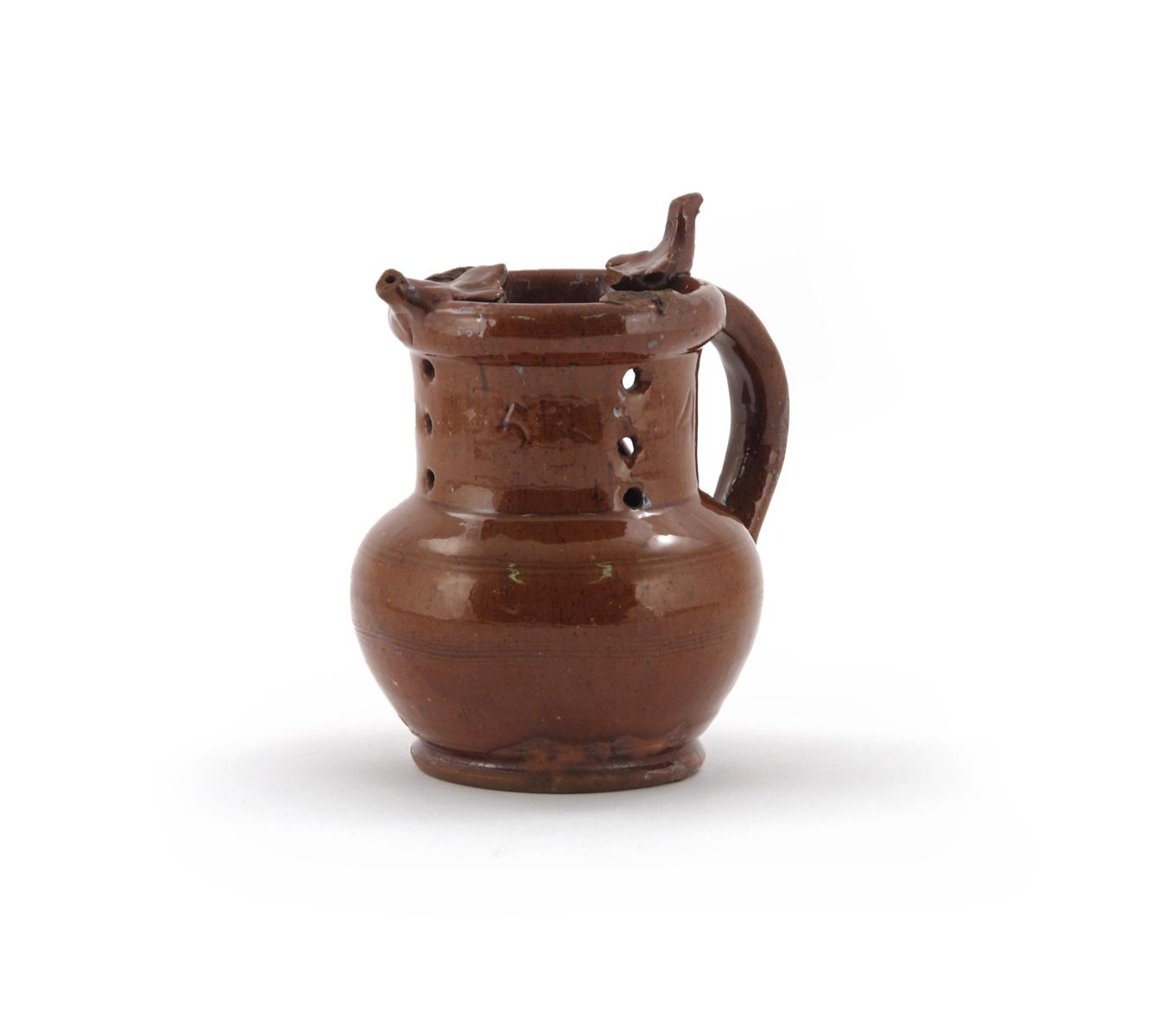 A dated English slipware puzzle jug c.1754, possibly Sussex, the squat body decorated in a treacle glaze, the neck pierced with holes and a large heart beneath the handle, the rim applied with birds, incised '1754', damages to the birds, 16cm.