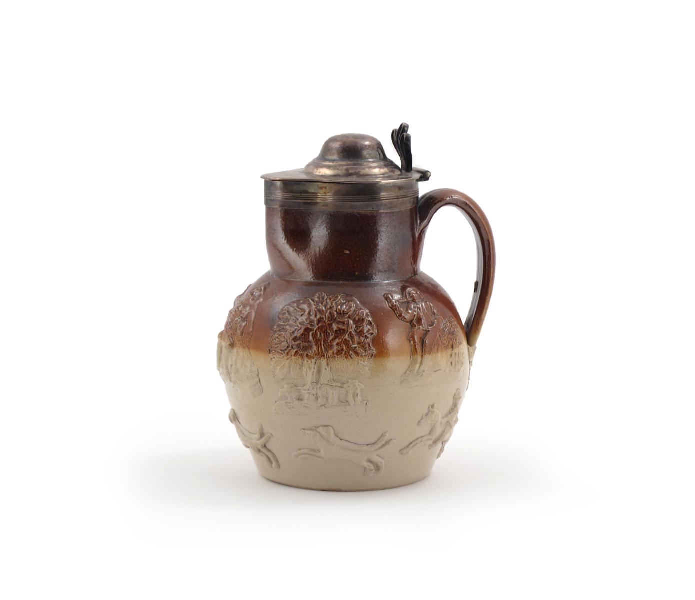 A silver-mounted brown stoneware hunting jug c.1827, sprigged with topers, trees and running hounds, the hinged silver lid with hallmarks for Spooner, Clowes & Co., Birmingham, 1827, 21cm high.