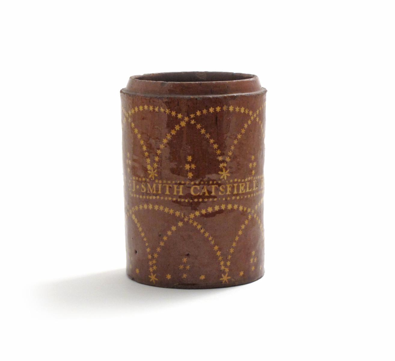 A Sussex pottery leadglaze tobacco jar dated 23rd February 1811, the cylindrical body decorated in a treacle glaze with yellow star garlands, inscribed 'J. Smith Catsfield Feb*23*1811', the cover lacking, 16.7cm.