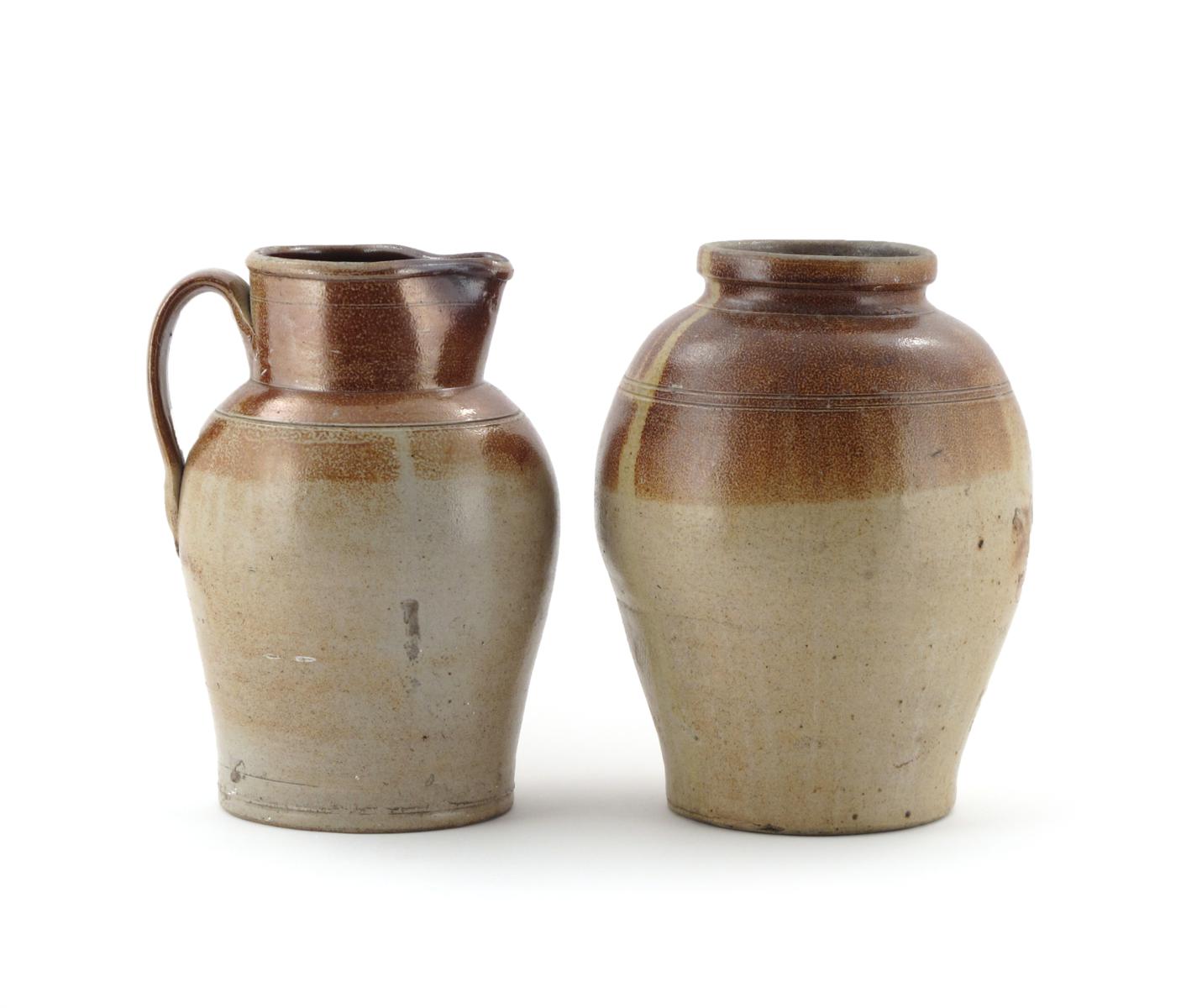 A large brown stoneware jar mid 18th century, probably Fulham, the ovoid shape with an incised band to the shoulder and a graduated brown glaze, and a similar large stoneware jug with strap handle, 31cm. (2)