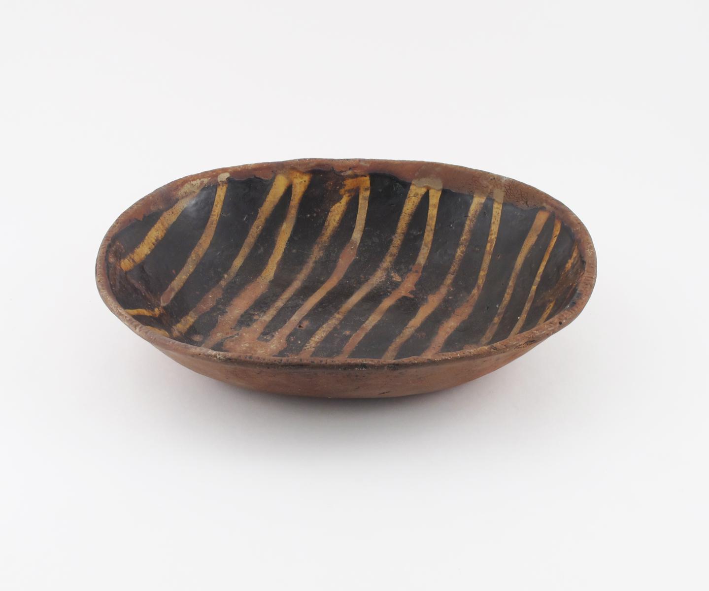 A large slipware dish mid 18th century, the rounded rectangular shape with pie-crust rim, the dark brown glaze trailed diagonally in yellow slip, some wear, 41.5cm.