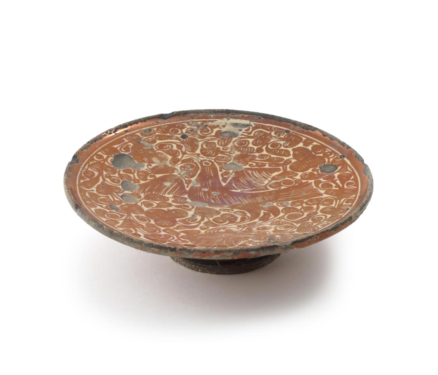 A Hispano-Moresque tazza 17th century, decorated in a rich copper lustre with a central bird within dense foliage, raised on a low foot, some glaze losses, 23.5cm dia.