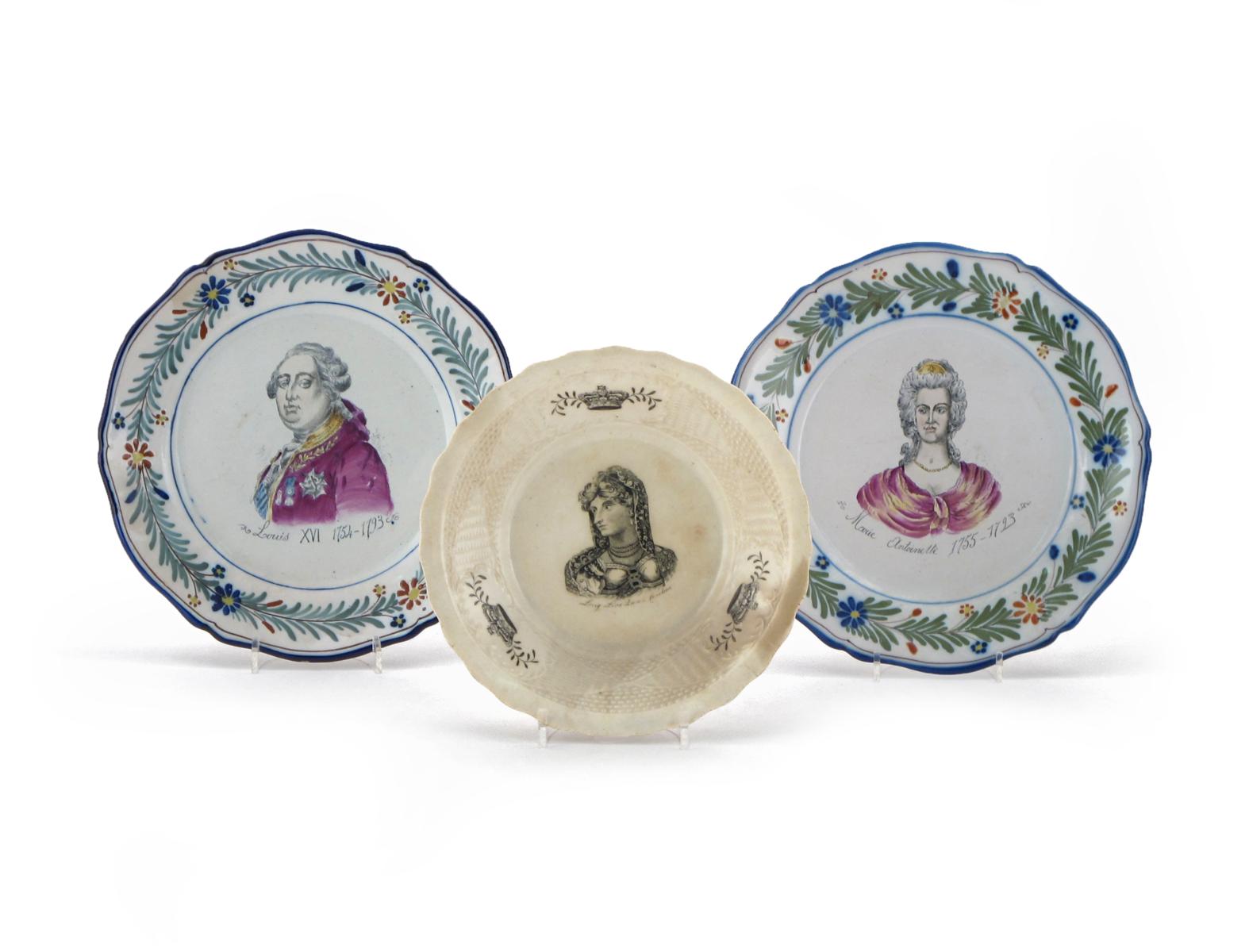 A pair of faïence commemorative plates 19th century, painted with titled portraits of Louis XVI and Marie Antoinette within stylized floral borders, and a pearlware plate with moulded border, printed in black with a portrait of Queen Caroline, 13.7cm max. (3)
