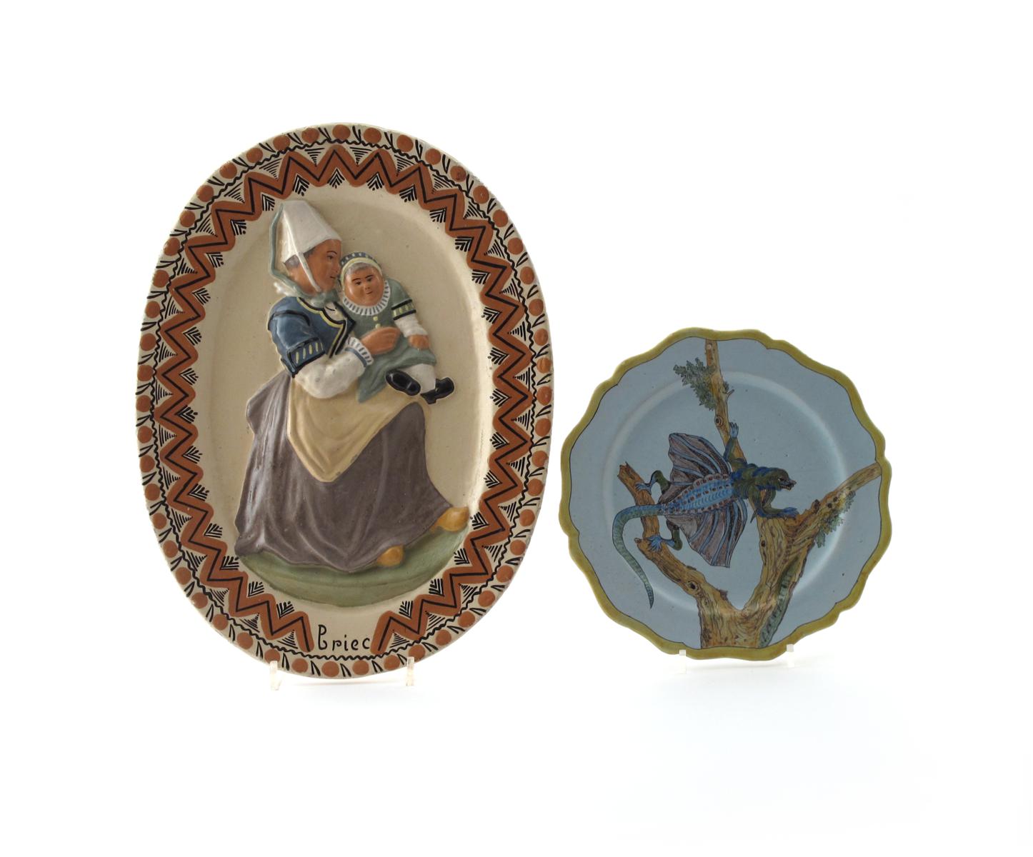 A rare Porquier-Beau Quimper relief-moulded plaque late 19th century, moulded in high relief with St Brieuc and an infant, PB monogram to the reverse, and an unusual Porquier-Beau plate painted with a flying lizard clambering over bare branches, 40.5cm max. (2)